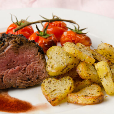Sotad oxfilé med rostade potatishjärtan, rödvinssky och ugnsbakade cocktailtomater