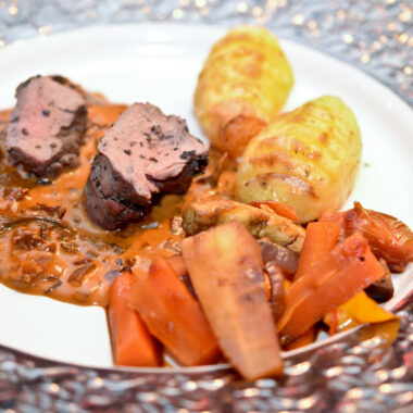 Grillad marinerad hjortfilé med hasselbackspotatis, kantarellsås och rostade grönsaker