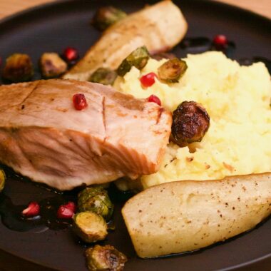 Lönnsirapsglazerad lax i ugn med brysselkål, päron och potatismos