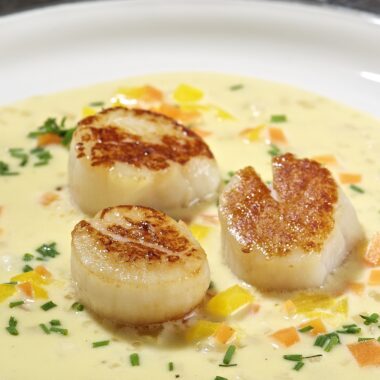 Halstrade pilgrimsmusslor på smörsåsspegel