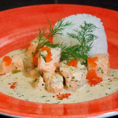 Laxkuber i krämig skaldjurssås med dill