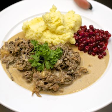 Konjaksdoftande renskavsgryta med mandelpotatismos och rårörda lingon