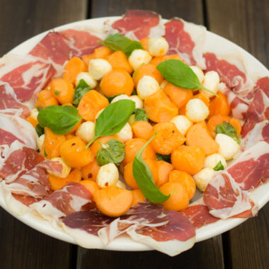 Mozzarella- och melonsallad med lufttorkad skinka samt basilika