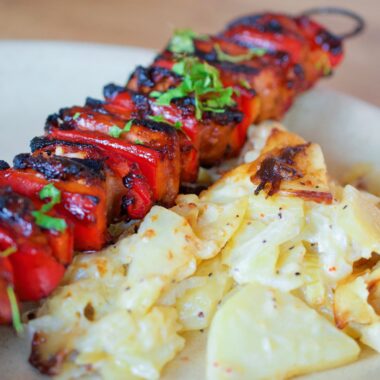 Vitlök- och farinsockergrillade kycklingspett med potatisgratäng