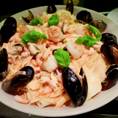 Pastagryta med blåmusslor, räkor & pilgrimsmusslor
