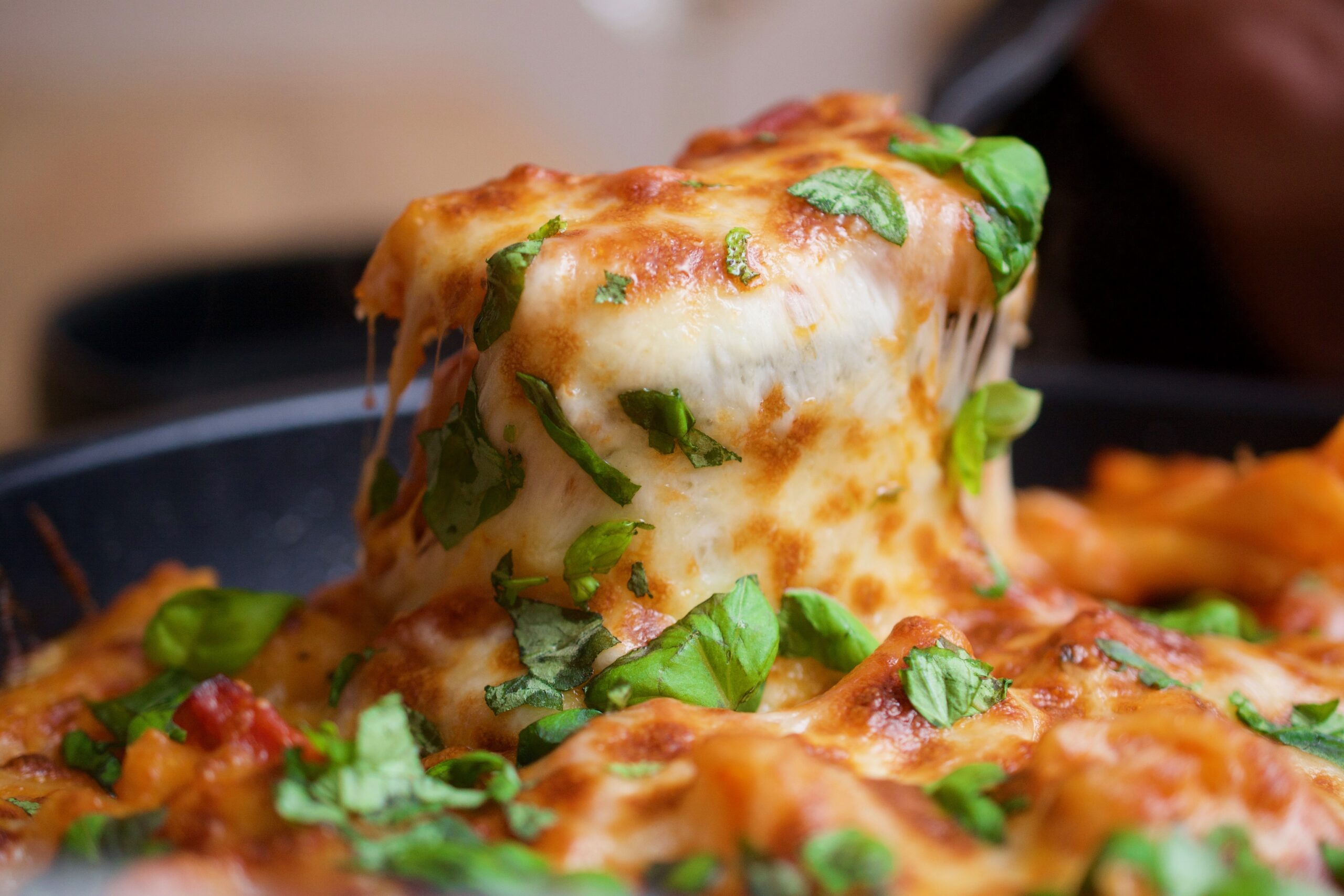 Ta ut gratängen och garnera med hackad färsk basilika.