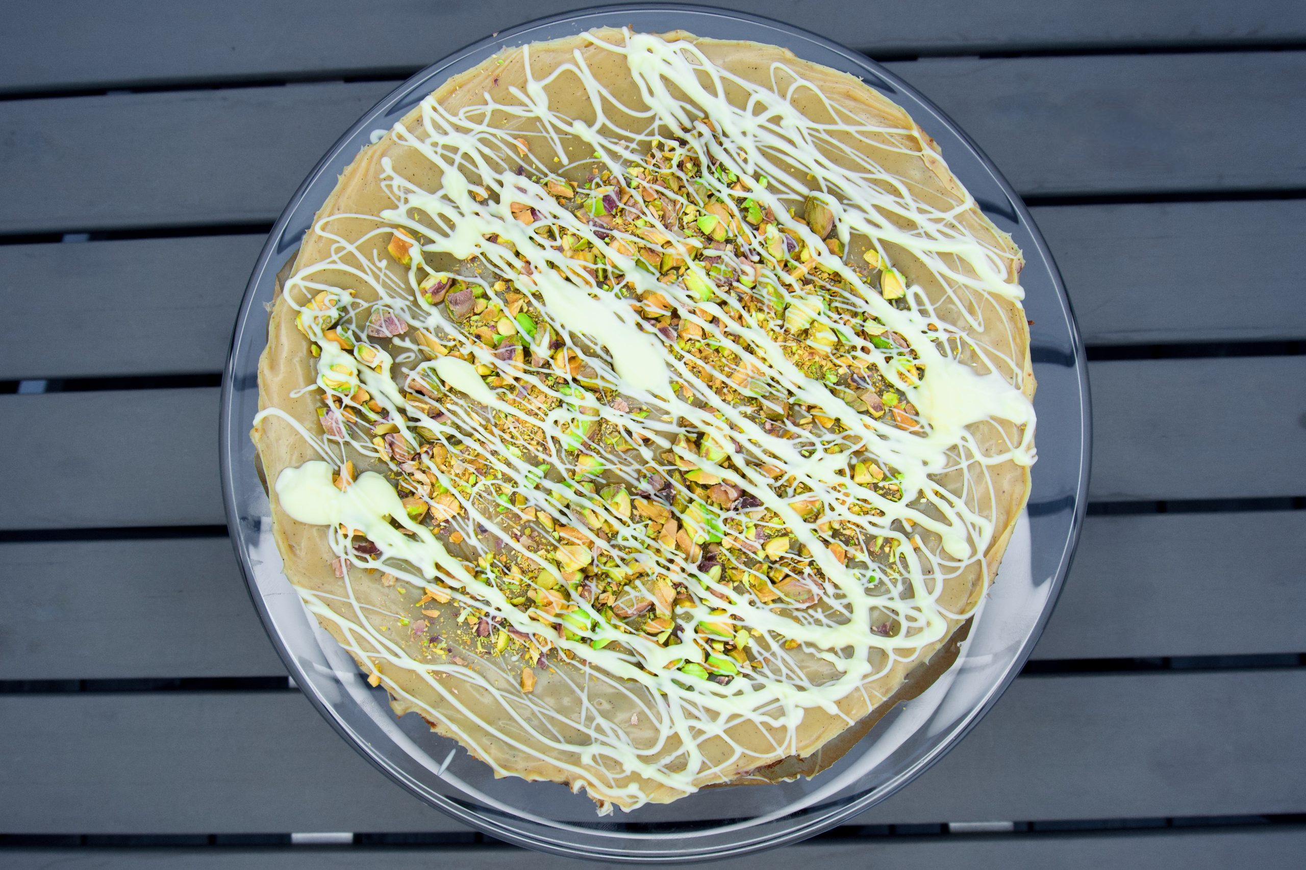 Strak innan servering hackar du och smälter chokladen till garneringen. Ringla chokladen över kakan och strö över pistagenötter som du har skalat och grovhackat.