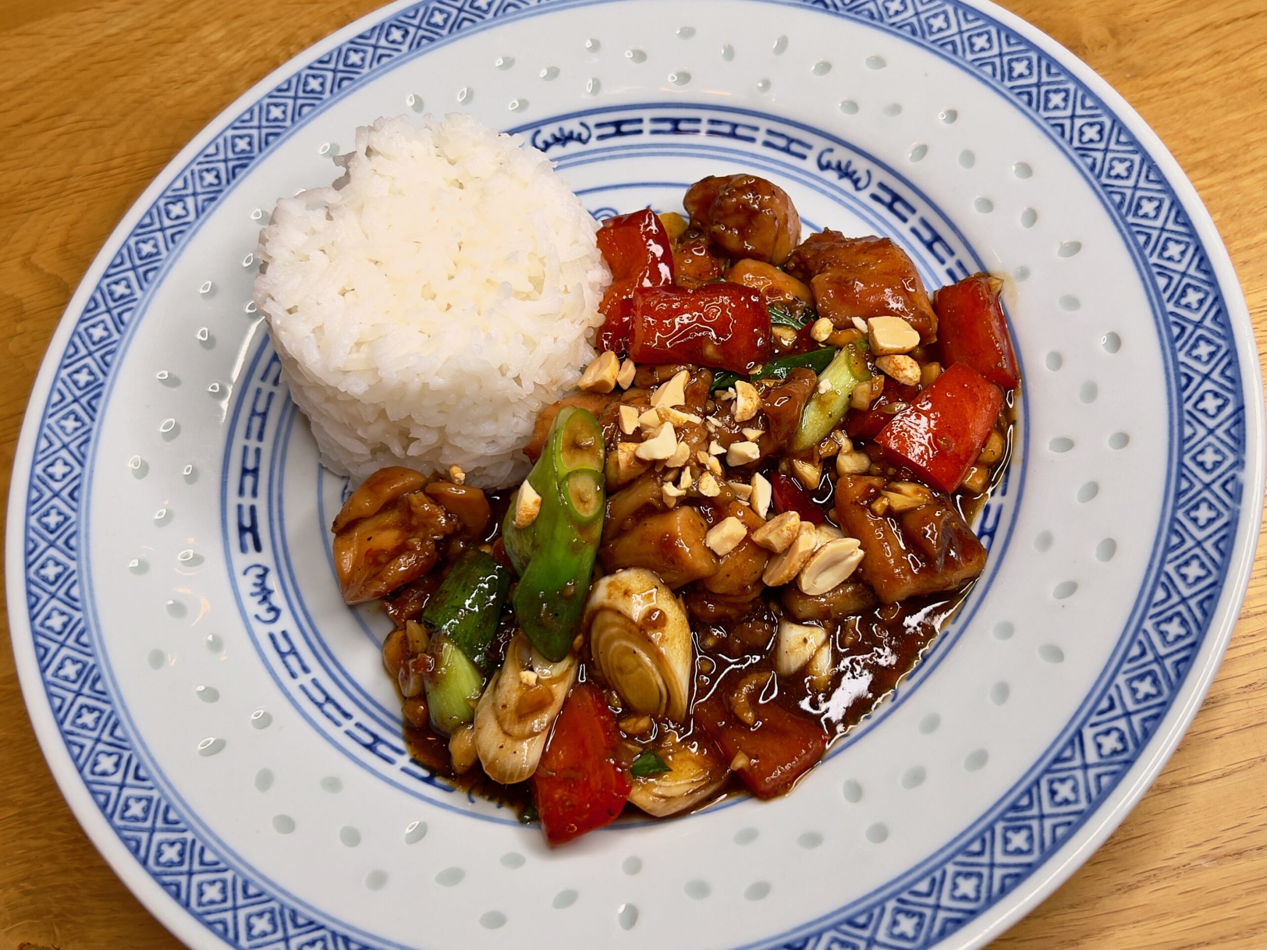 Denna rätt kan också kallas för Gong Bao Ji Ding och är en välkänd kinesisk maträtt, de traditionella ingredienserna är tärnad kycklingfilé, torkad chili, sichanpeppar, den vita delen på salladslöken, ingefära, vitlök, jordnötter i en sötsur sås. Detta är en typisk smakkombination från Sichuan.