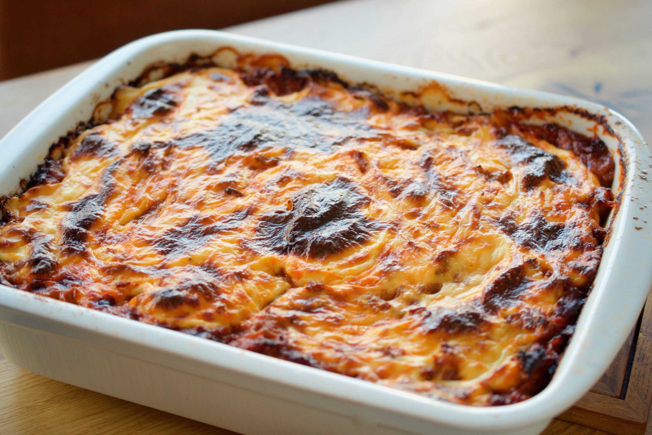Ta fram en ugnssäker form som är ca 30 x 24 cm och varva lammfärssås, potatisskivor, aubergineskivor och béchamellsås. Börja med lammfärssåsen. Upprepa tills formen är fylld.