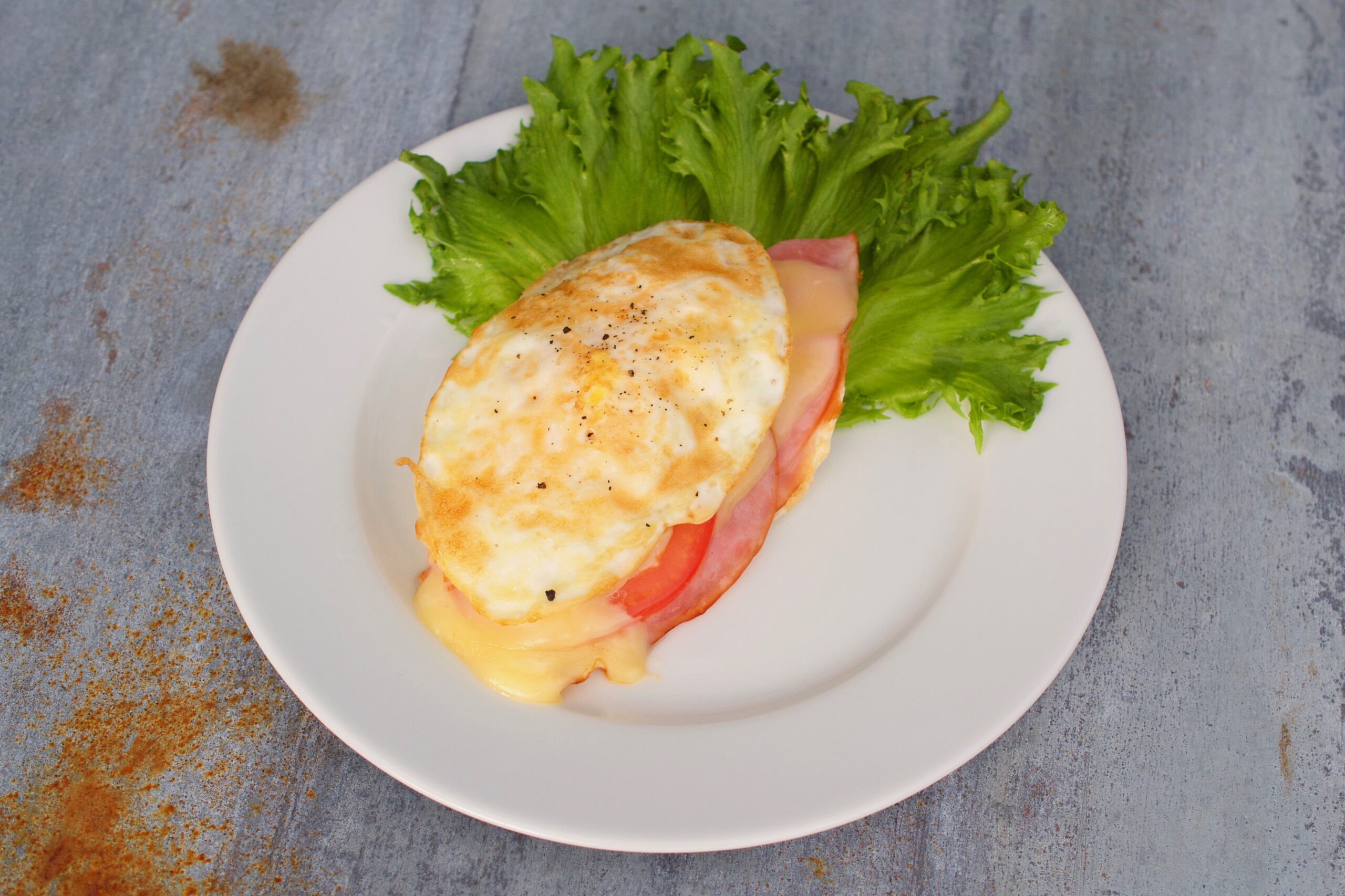 - Lägg på tre skivor skinka var på två utav äggen, lägg därefter på en varsin skiva ost på skinkan, fortsätt med att lägga på två skivor tomat på osten och sedan ytterligare en skiva ost ovanpå tomatskivorna. Avsluta med att lägga på de andra äggen som ett lock.